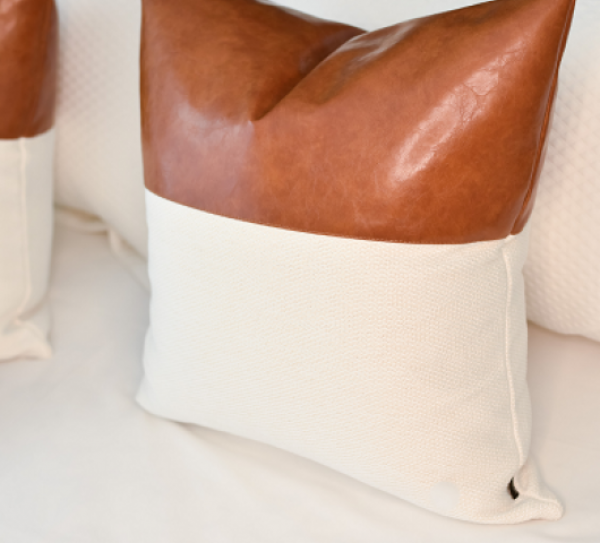 ALMOFADA COURO CARAMELO E LINHO BRANCO (QUADRADA)