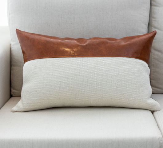 ALMOFADA COURO CARAMELO E LINHO BRANCO (RETANGULAR)